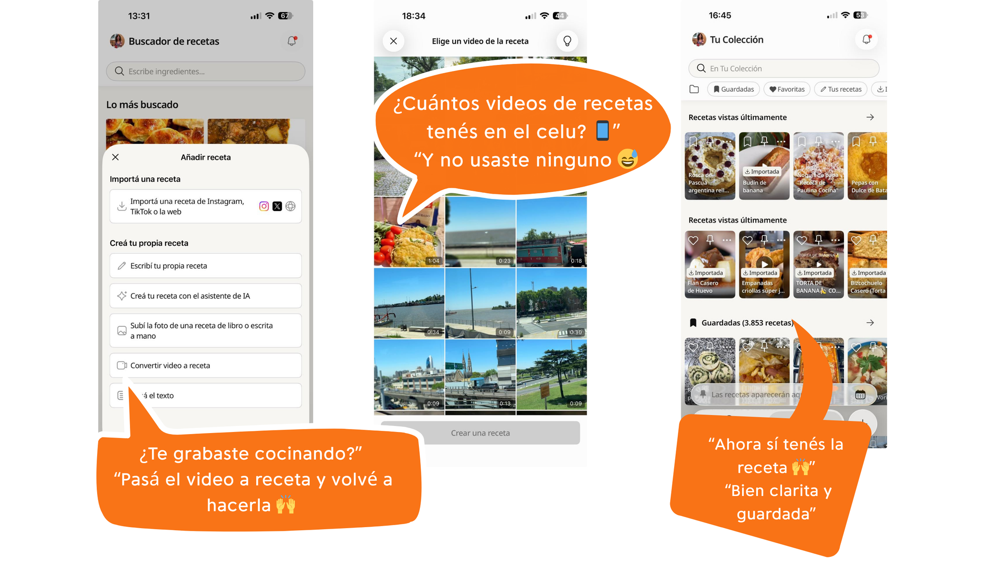 Funciona con cualquier receta que esté online. Ese budín de banana del video que se perdió entre el feed. La tarta de atún del perfil que dejaste de seguir. Todo en un lugar, para siempre.