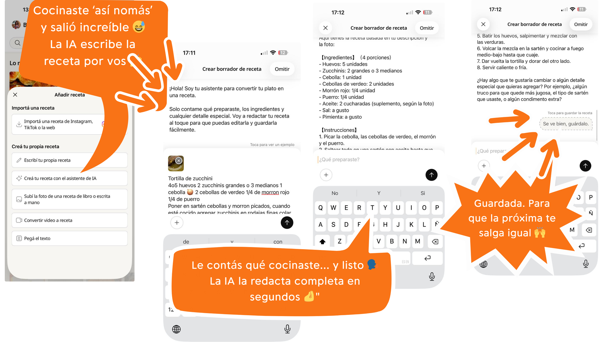 Describíselo al asistente de IA — los ingredientes, cómo lo cocinaste, para cuántas personas — y la IA escribe la receta por vos. Lista para guardar en tu recetario personal y repetir cuando quieras.