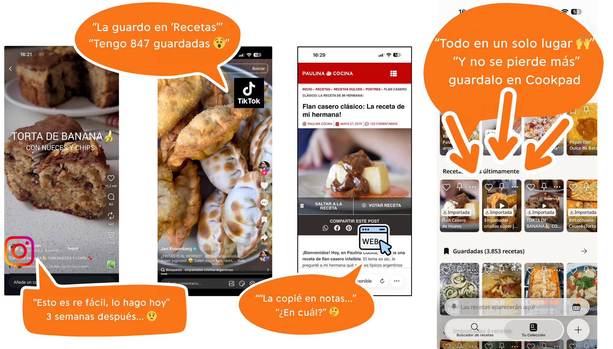 Encontraste una receta en Instagram, TikTok, YouTube o cualquier sitio web. Copiás el link, lo pegás en Cookpad y la IA extrae los ingredientes y los pasos automáticamente. En segundos queda guardada en tu recetario personal — sin capturas de pantalla, sin favoritos perdidos.