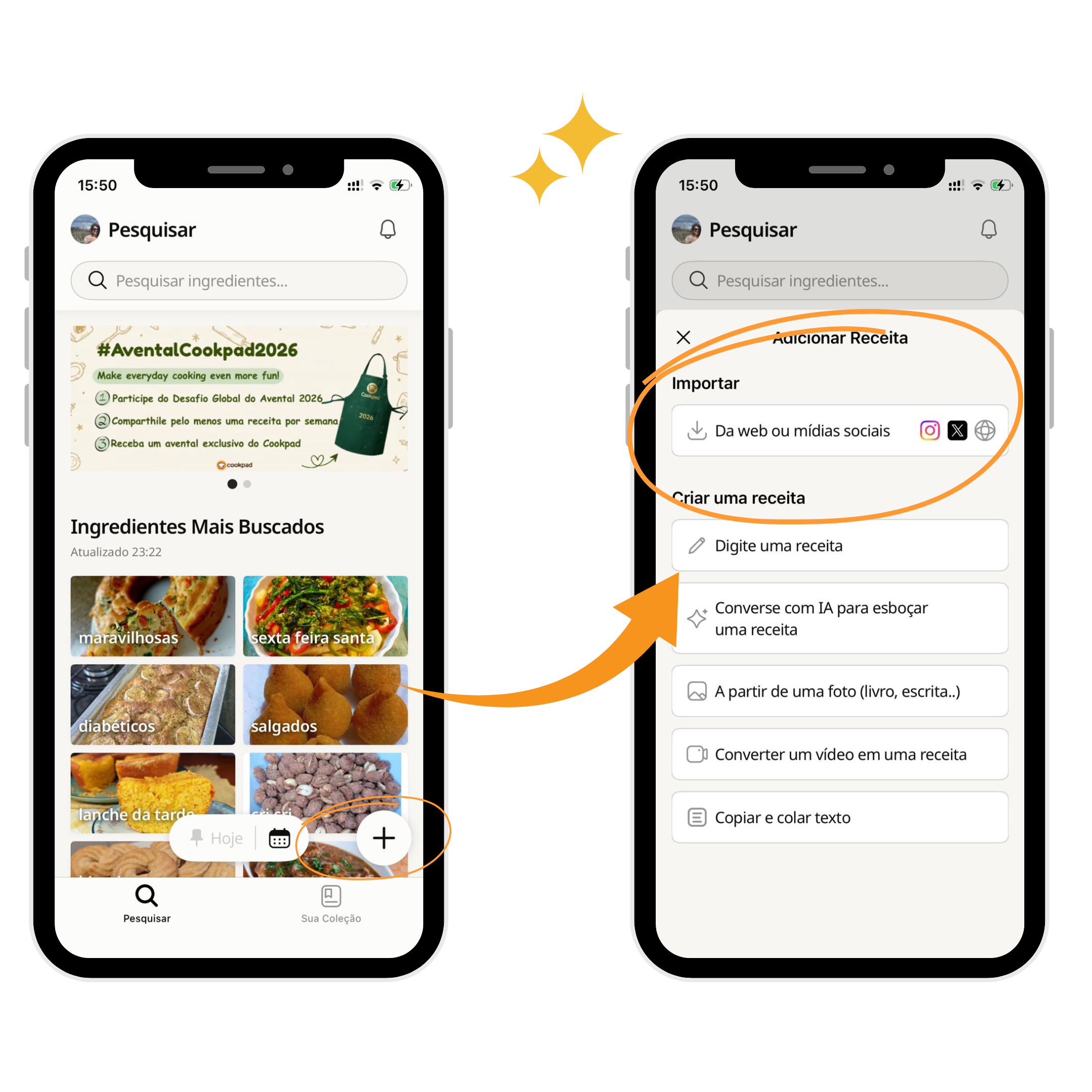 Abra o Cookpad → toque no símbolo "+" → selecione "Importar da web ou redes sociais" → cole o link. Pronto! ✅