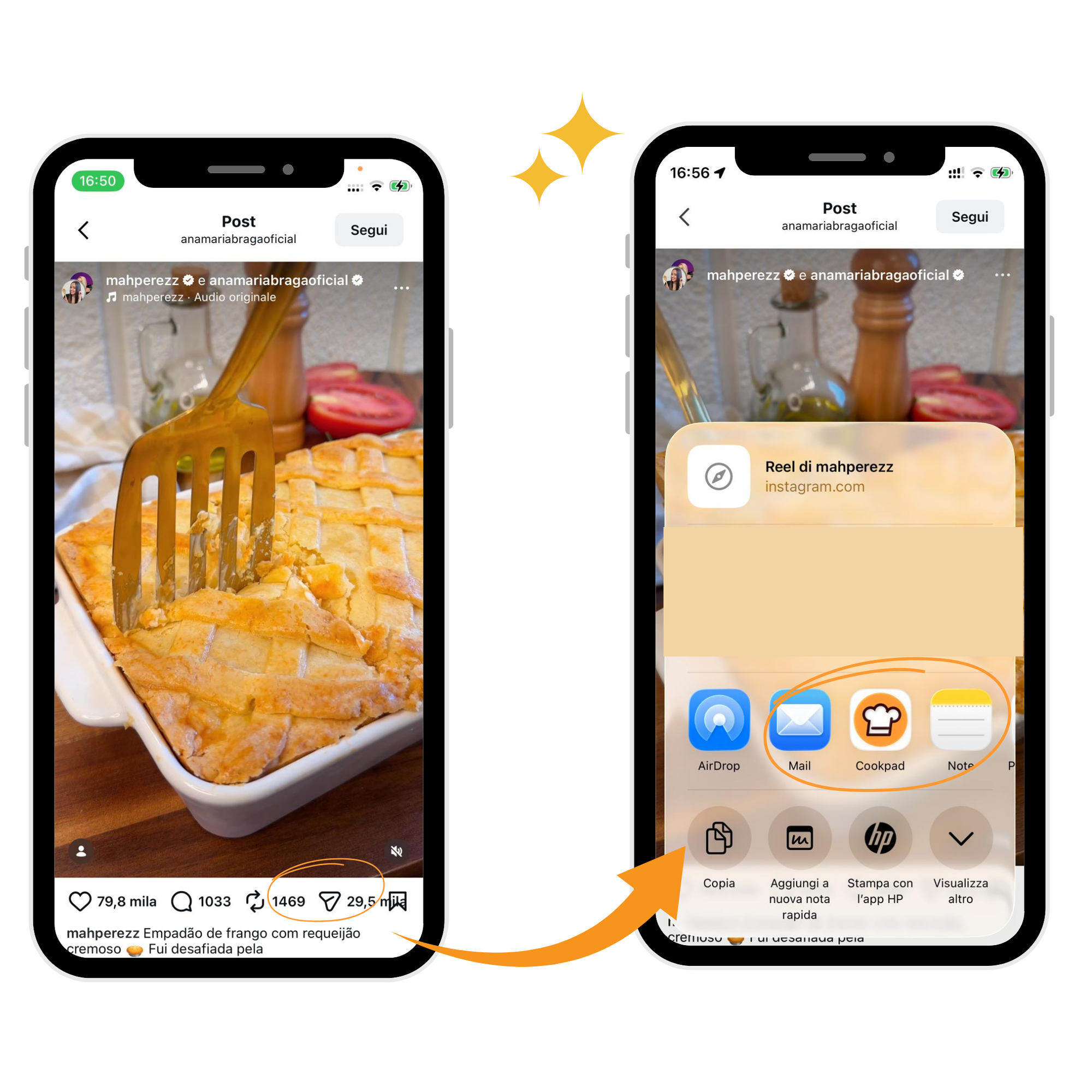 Quando você ver uma receita no Instagram ou TikTok: toque no ícone de compartilhar → escolha Cookpad