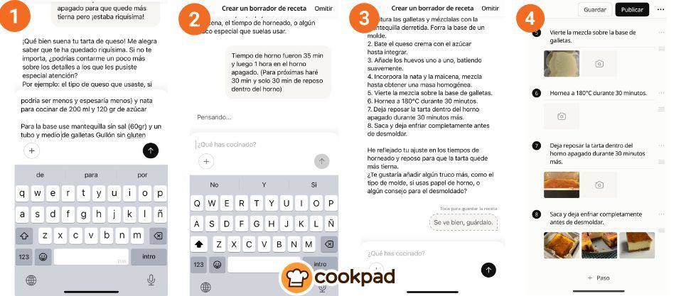 Puedes escribir tu receta desde cero o dejar que el asistente te ayude: cuéntale cómo la hiciste y te la ordenará paso a paso para que todo quede claro, práctico y bonito. Desde ese punto te genera la receta y ya editas añadiendo más detalles al revisarla.