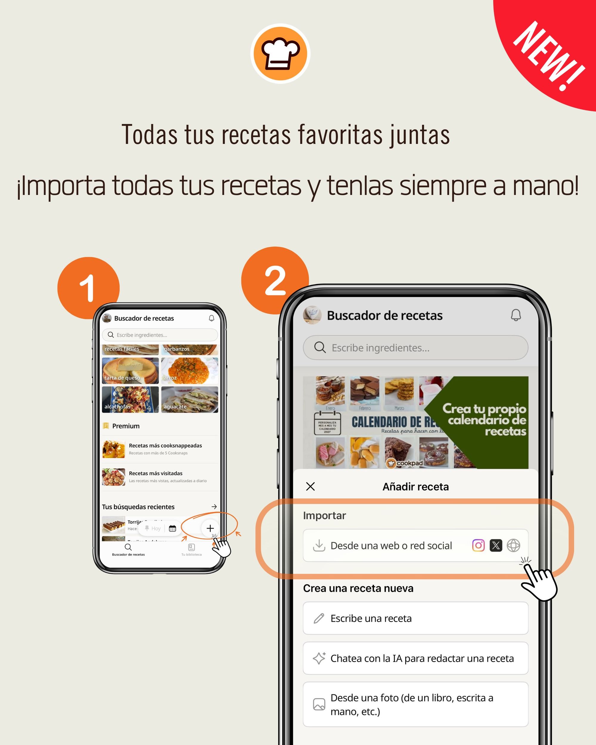 ¿Tienes carpetas de recetas en otras redes sociales, cajas con recetas de revistas y periódicos, libretas familiares y muchísimas recetas en diferentes sitios que luego no encuentras? ¡Ahora con Cookpad puedes importar todas las recetas que te gustan y tenerlas en tu colección!