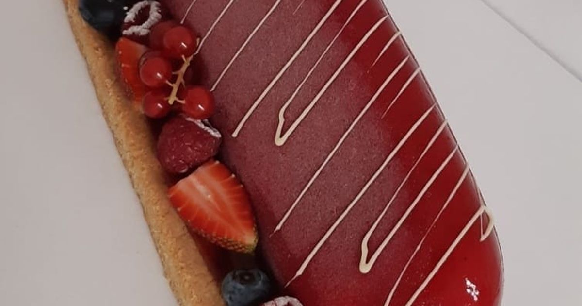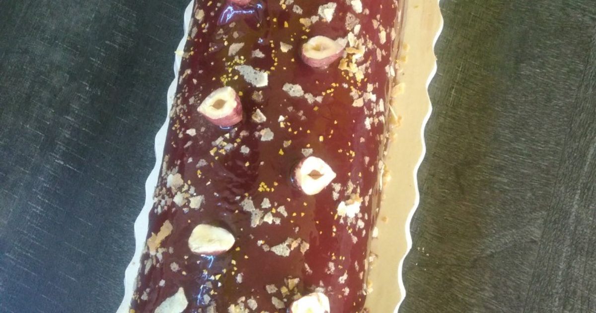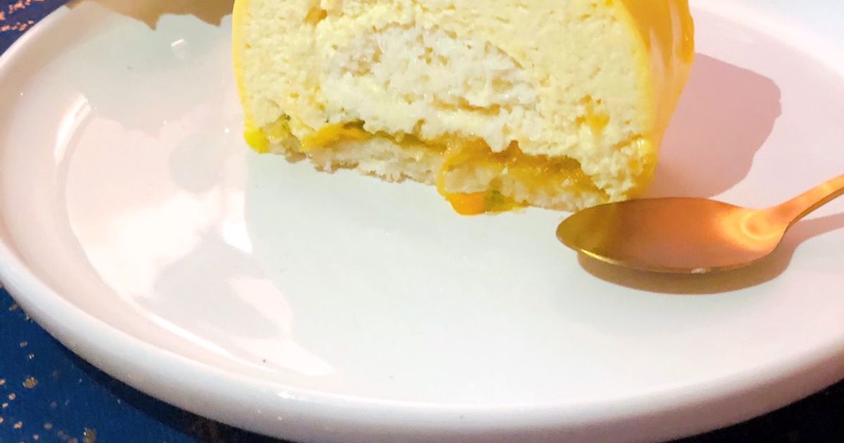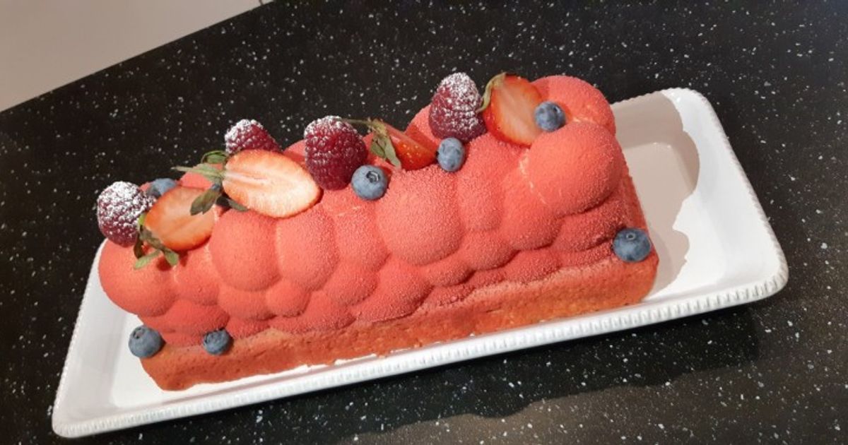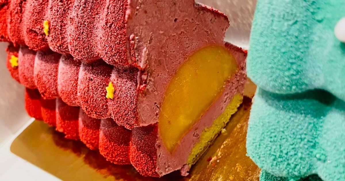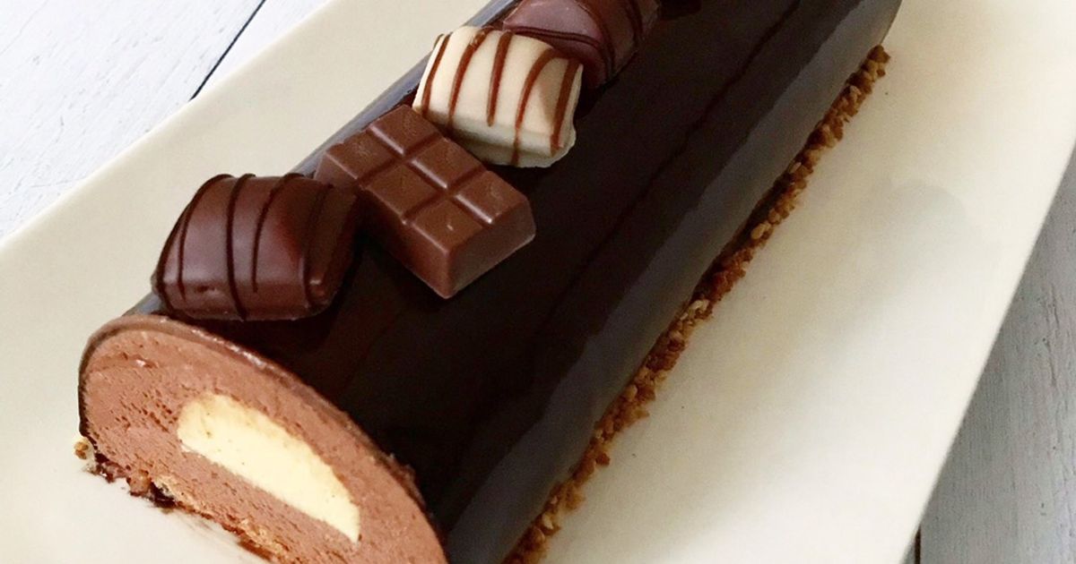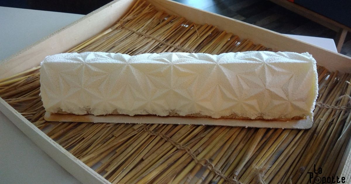 Bûche avec insert fruit : un entremets moderne avec une mousse vanille ou chocolat et un cœur framboise, mangue ou passion.