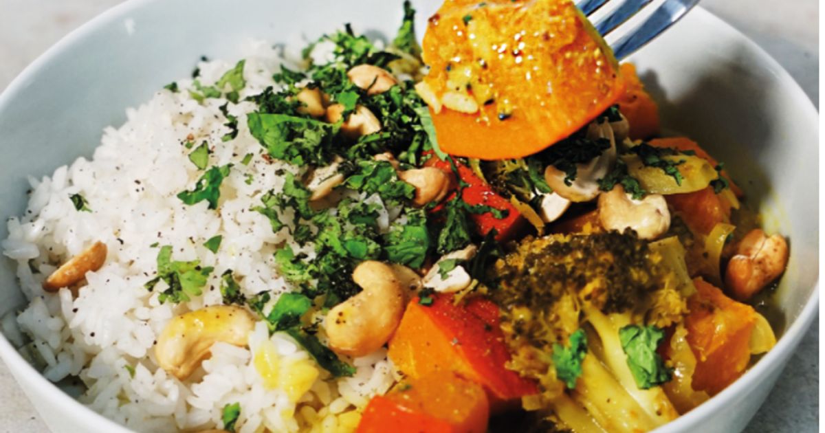 Envie de voyage ? Ce curry végétarien est à la fois parfumé, crémeux et rassasiant. Faites revenir des épices (curcuma, cumin, curry), ajoutez le potimarron, du lait de coco et laissez mijoter doucement. Servez avec du riz basmati.
