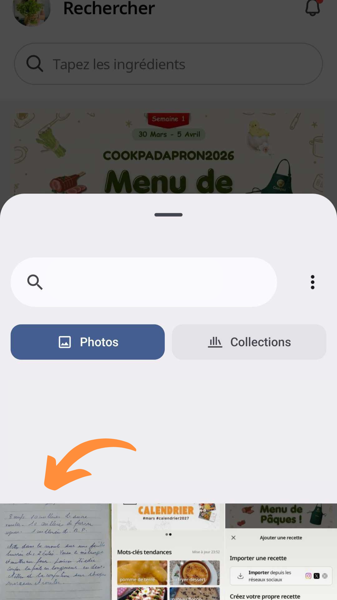 Cookpad centralise tout ça en un seul endroit dans votre Collection personnelle de recettes — où vous pouvez rechercher n'importe quelle recette par nom ou par ingrédient.