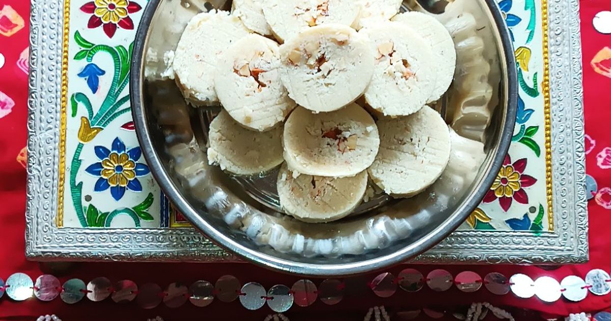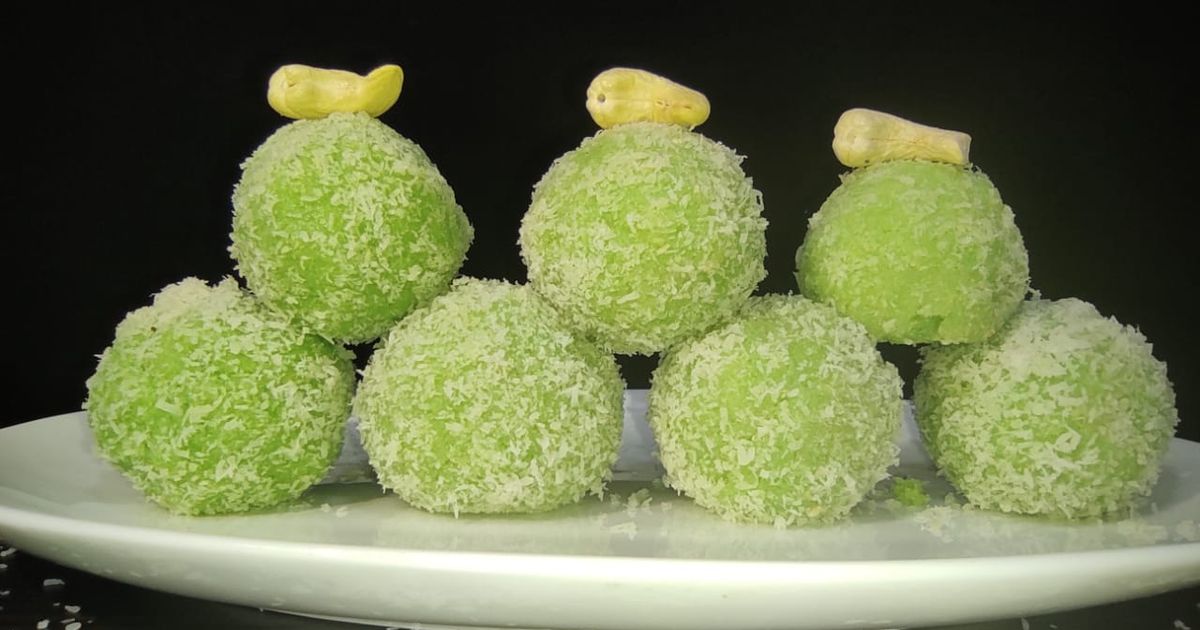 A no-fire Diwali dessert made in 10 minutes! Mix desiccated coconut, condensed milk, and a pinch of cardamom — roll, chill, done.