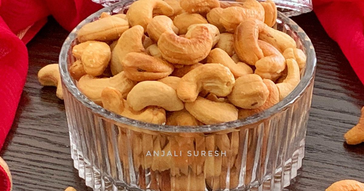 Toss cashews with salt and ghee, roast till golden. A simple, elegant snack that’s always a crowd-pleaser.