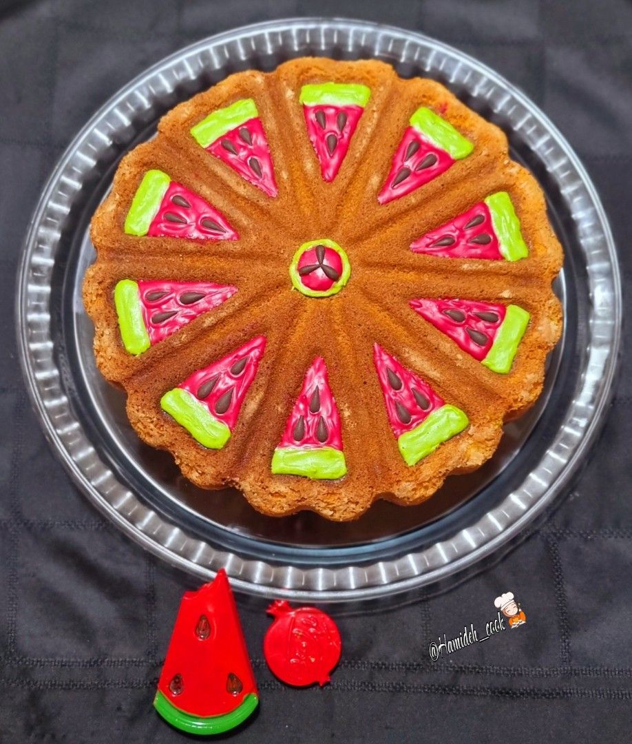 معمولاً با رنگ کردن لایههای کیک به سبز، سفید و قرمز و استفاده از شکلاتچیپسی یا دانههای تزیینی برای ایجاد طرح “تخم هندوانه” میتوان یک کیک هندوانهای زیبا ساخت.