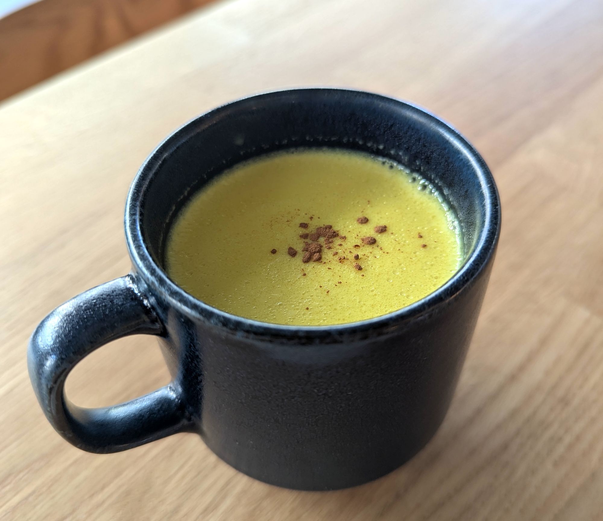 2〜3分加熱し、ターメリックと牛乳の色が混ざり合って可愛らしいクリームイエローになります。沸騰直前で火を止めて、カップに注ぎます。