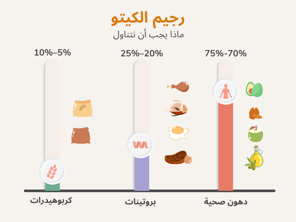 - 70–75% دهون صحية (مثل زيت الزيتون، الأفوكادو، الزبدة الطبيعية)