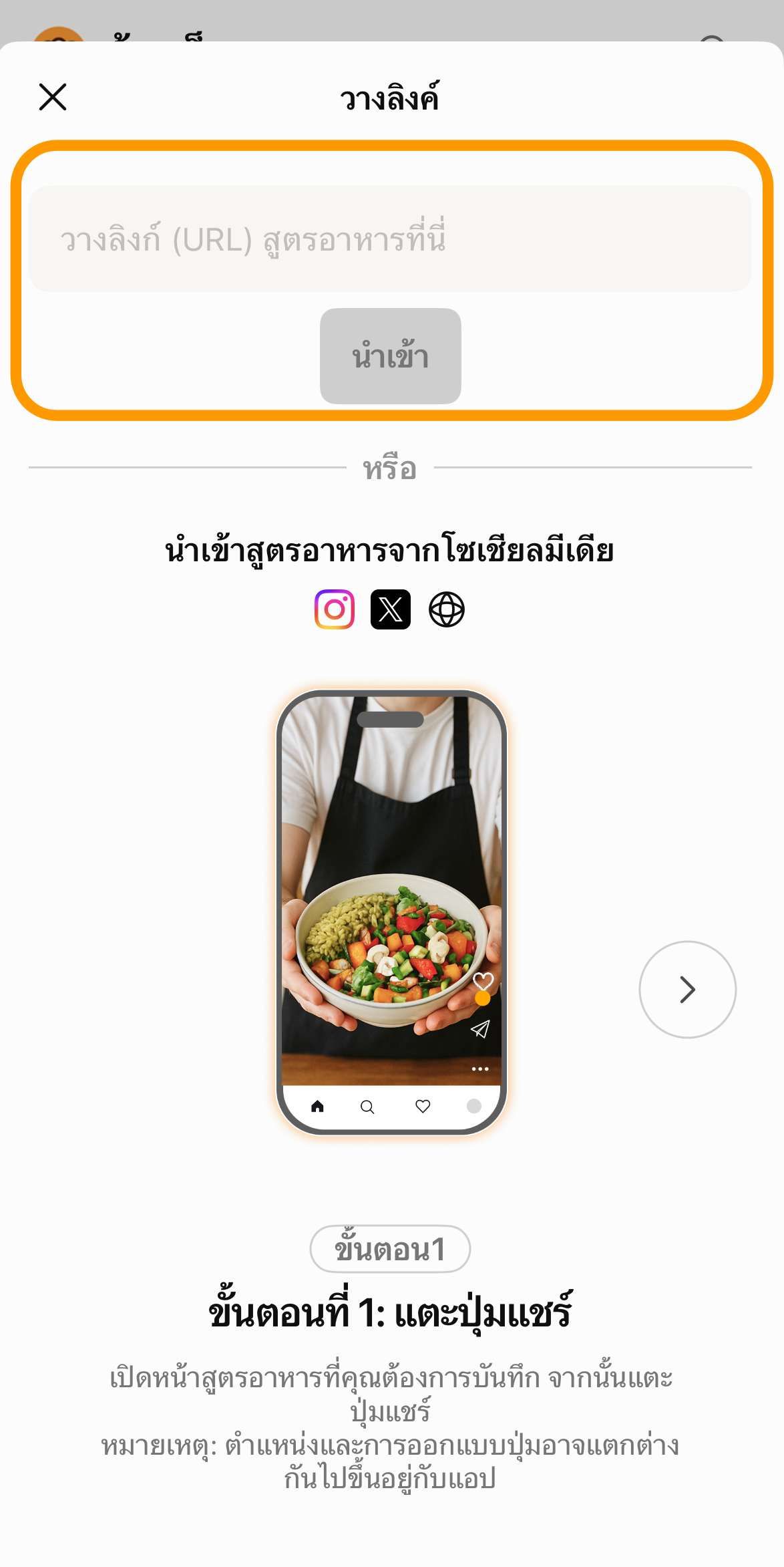 2. วางลิงก์ใน Cookpad: คัดลอกลิงก์ -> เปิดแอปกดเครื่องหมาย "+" -> เลือก "นำเข้าสูตรจากเว็บหรือโซเชียลมีเดีย" -> วางลิงก์แล้วกด "นำเข้า"