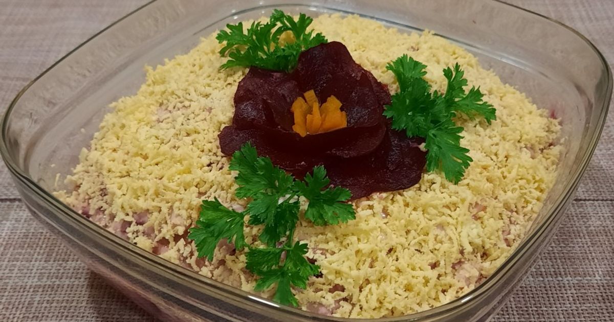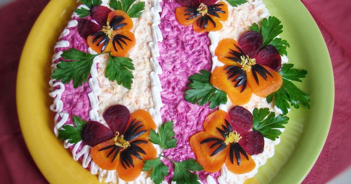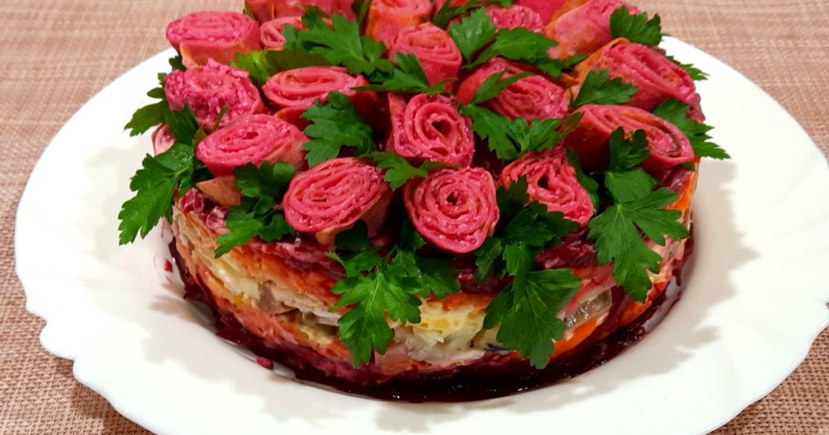 #ЗолотийФартух23 #мійкалендар Пропоную вам смачний, закусочний торт ”оселедець під шубою”, прикрашений червоними трояндами з млинців та зеленню петрушки. Вийшло дуже смачно! Таку страву важко не помітити на святковому столі.😊😋