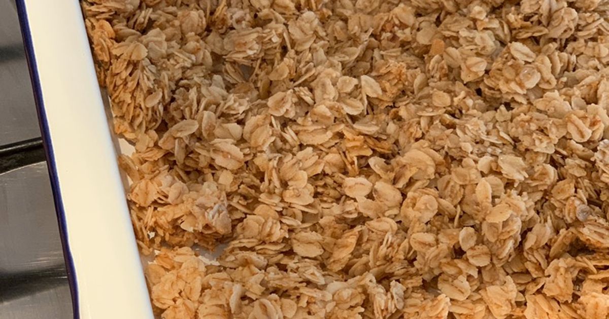Granola is a baked mixture of grains, nuts, seeds and natural sweeteners that forms crunchy clusters after cooling.