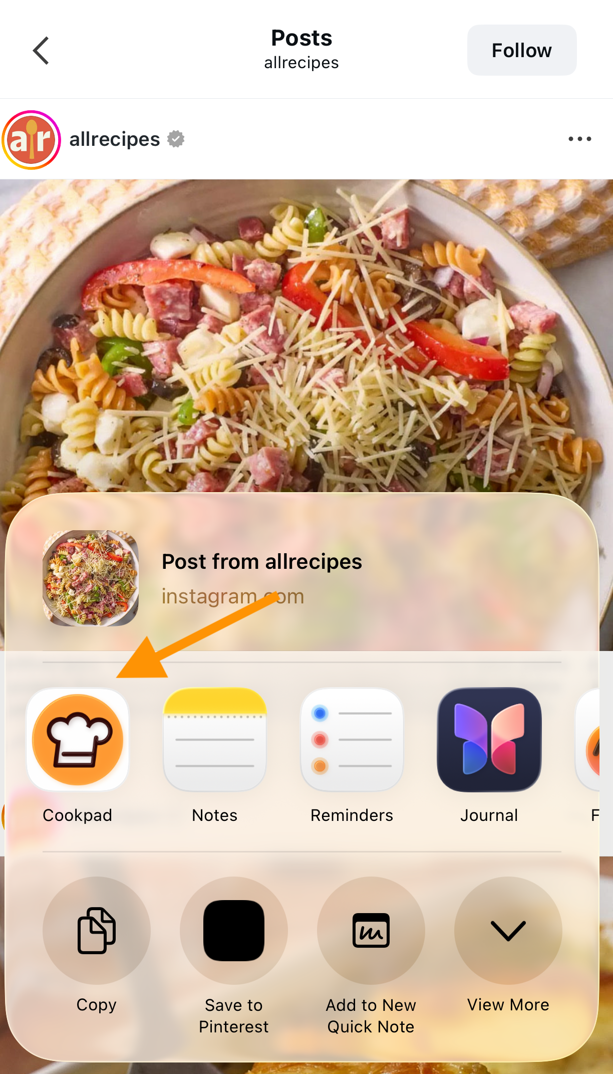 ⚠️ The sharing function is designed differently for each platform. The screenshot below uses Instagram as an example. - Select Cookpad from the sharing options.