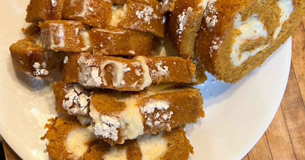 A pumpkin roll combines spiced sponge cake with a creamy filling rolled into an elegant swirl. It’s festive, impressive, and a classic autumn dessert.