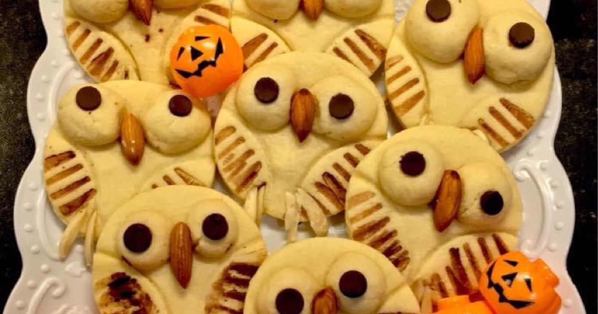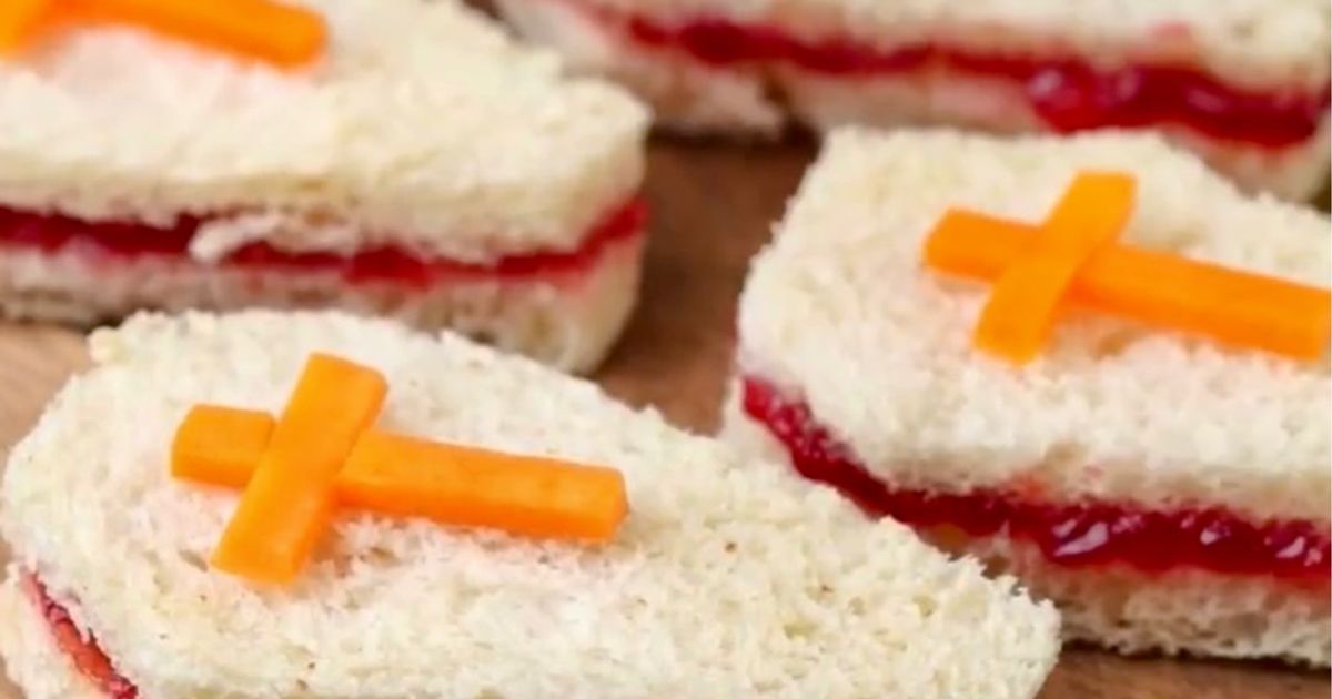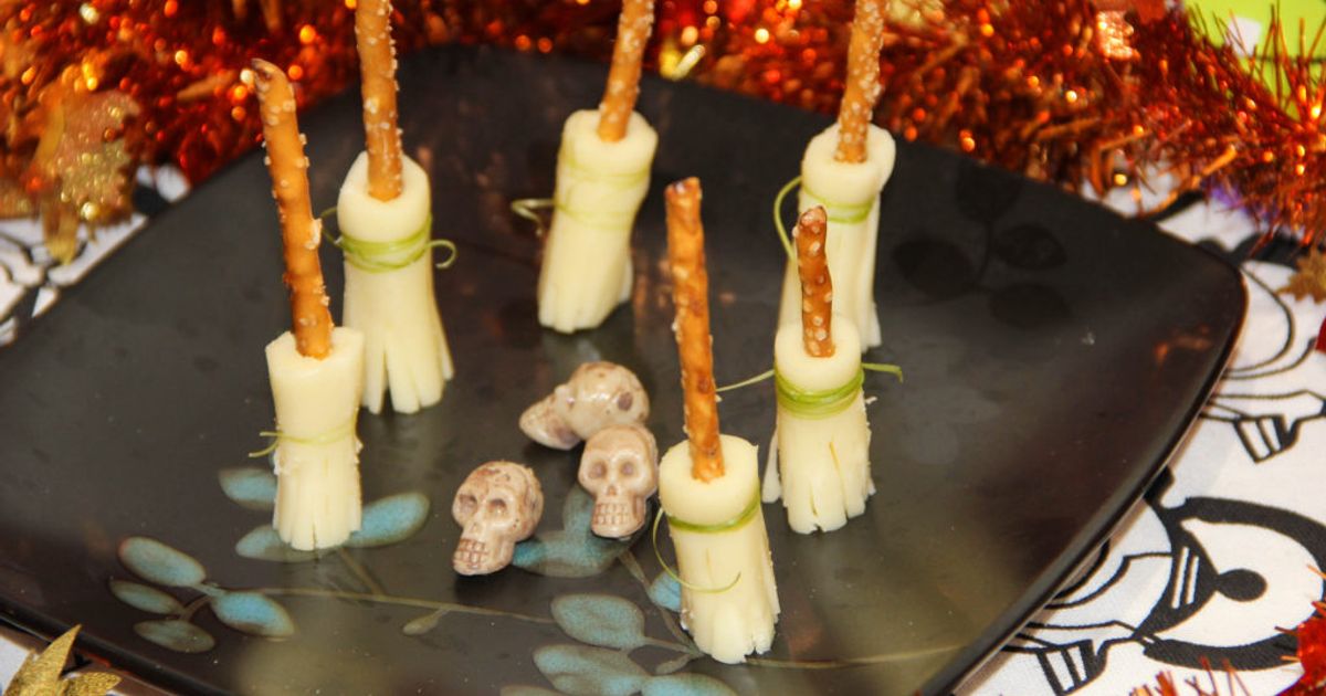 Mini pizzas with olive spiders, ghost-shaped pastries, and Halloween appetizers like cheese broomsticks are perfect.