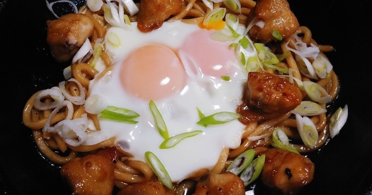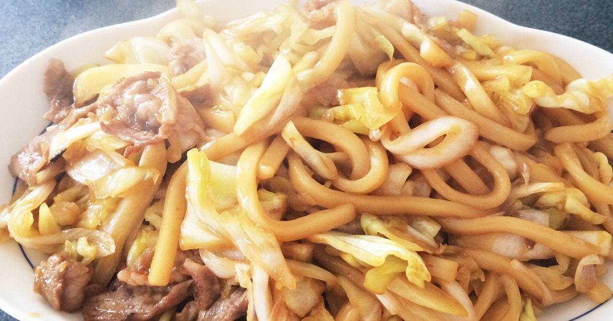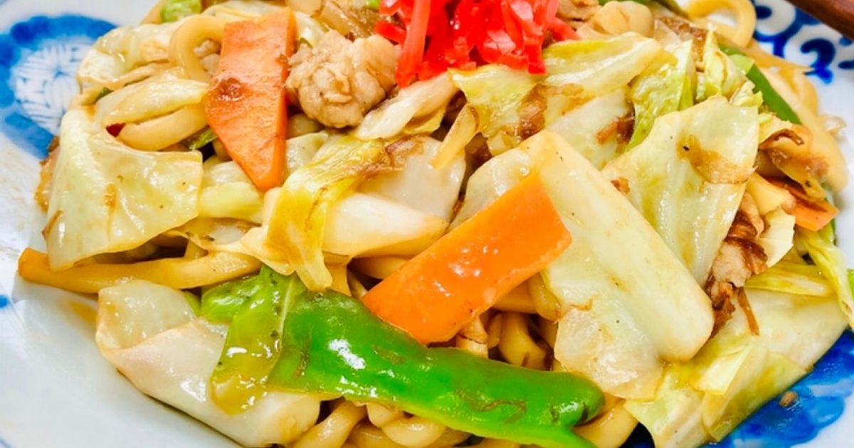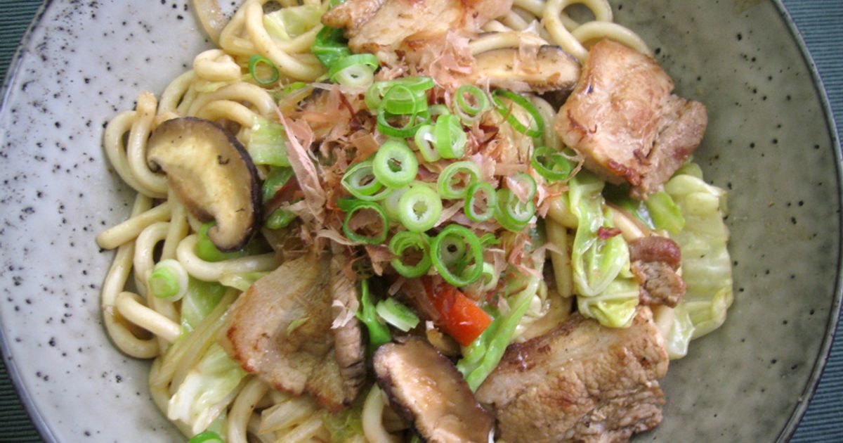 A Japanese stir-fried noodle dish made with thick udon noodles, vegetables, and protein in a soy-based sauce.