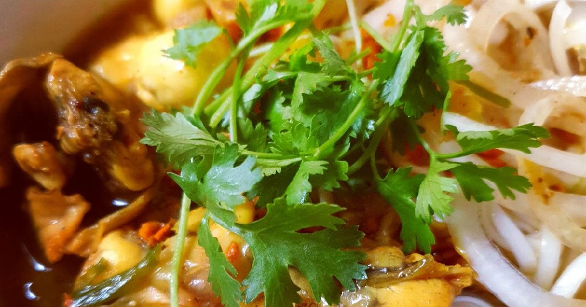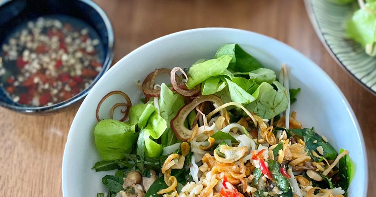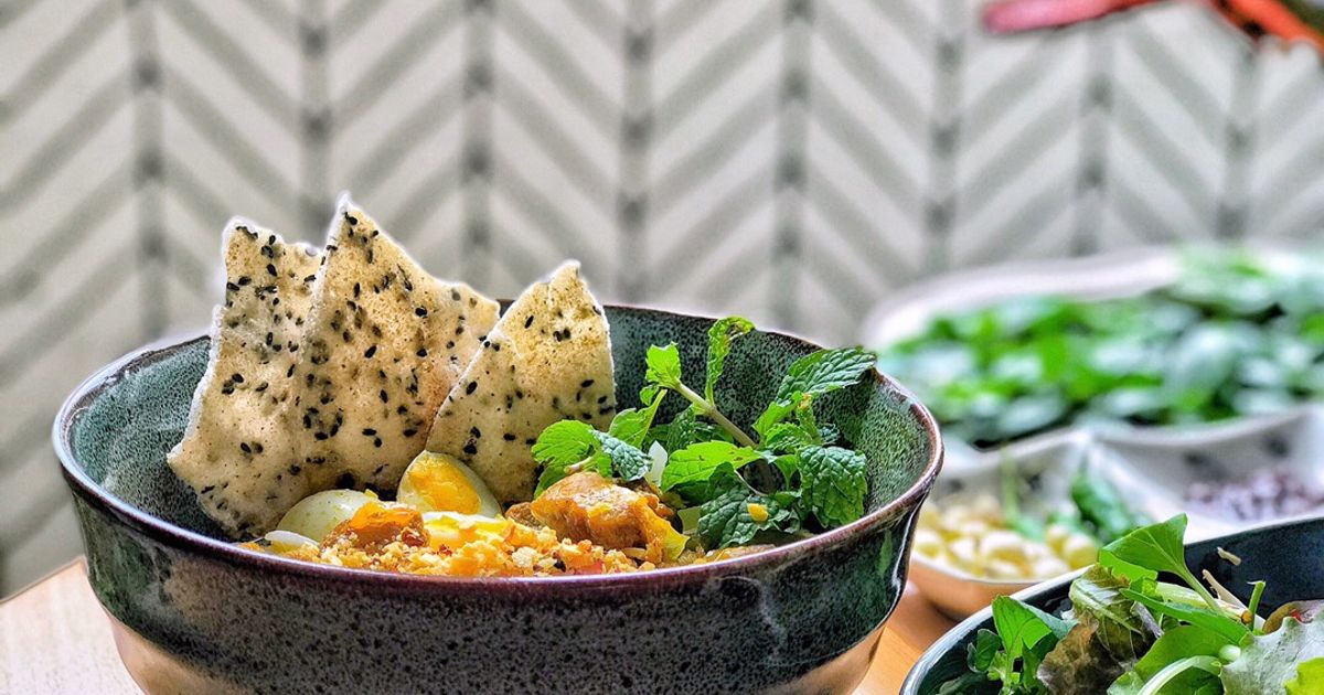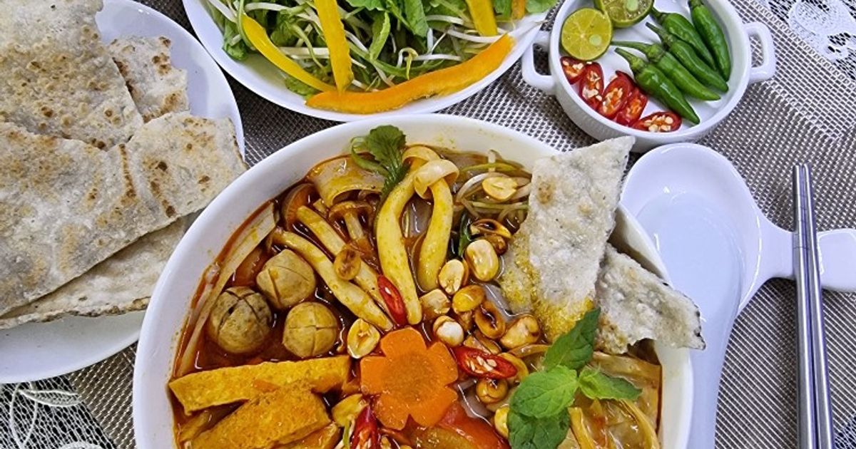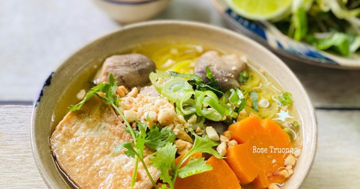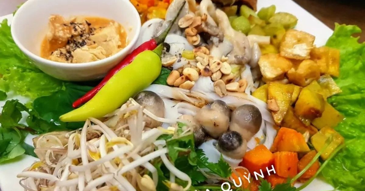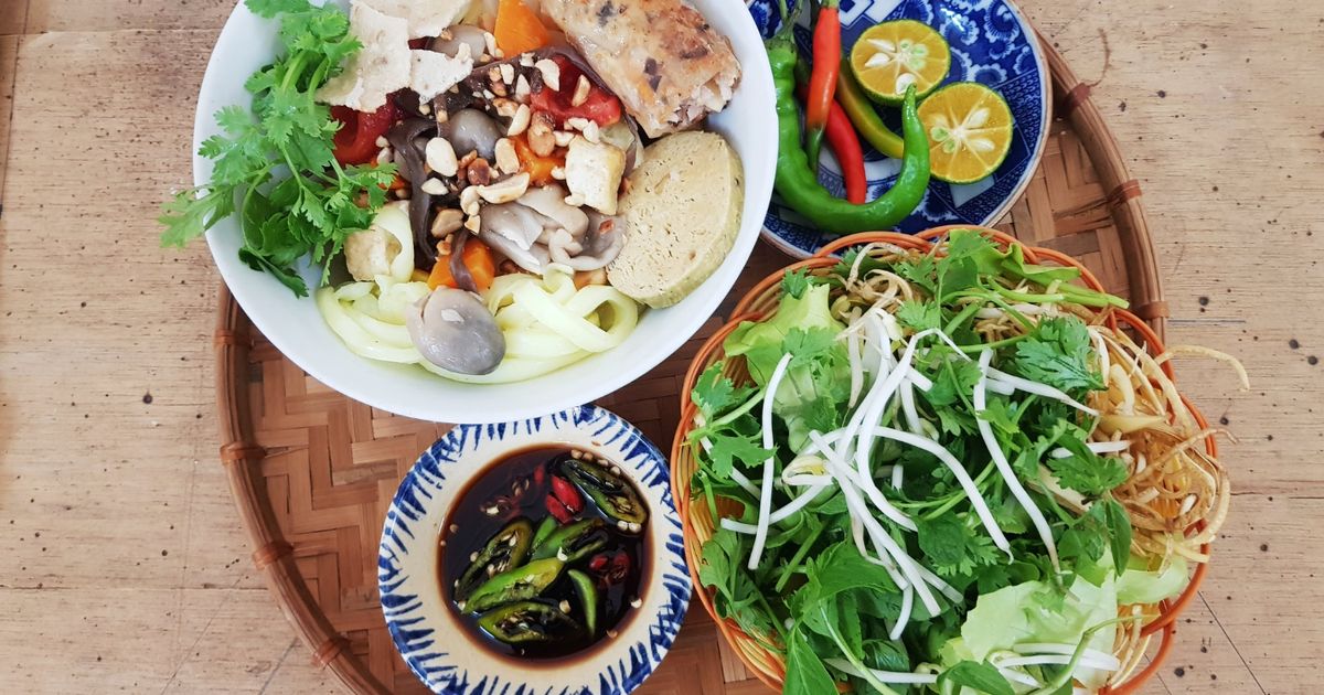 Mì quảng chay sử dụng đậu hũ, nấm và rau củ, nấu cùng nhưn chay sền sệt. Dù không có thịt cá, món ăn vẫn đậm đà nhờ cách nêm nếm và các nguyên liệu truyền thống như đậu phộng, rau sống, bánh tráng. Đây là lựa chọn nhẹ nhàng, phù hợp cho người ăn chay hoặc muốn đổi vị.