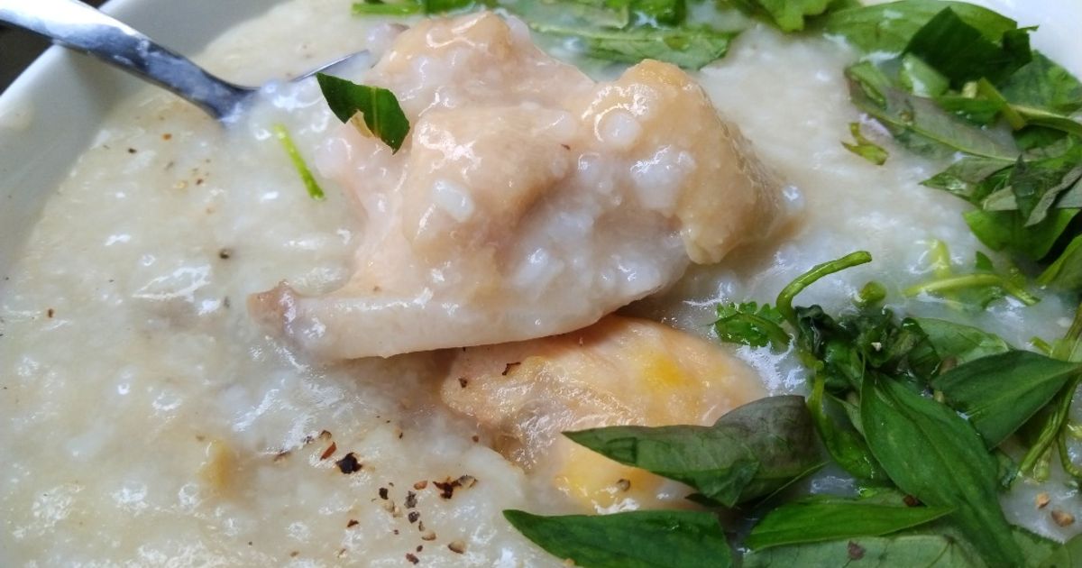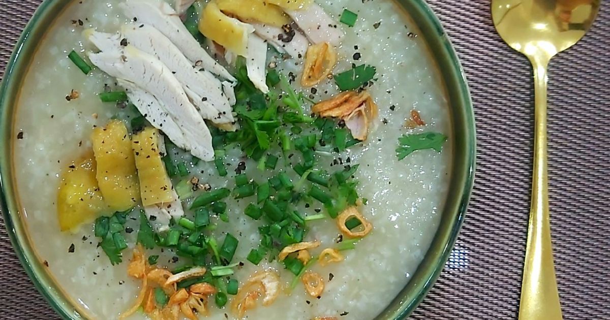 Nước luộc gà đã ngọt sẵn nên chỉ cần thêm gạo, nấm hương và hành lá là có nồi cháo nóng hổi. Các phần cổ, cánh và xương giúp nước cháo trở nên đậm ngọt, rất thích hợp cho bữa sáng hoặc khi cần món dễ tiêu.