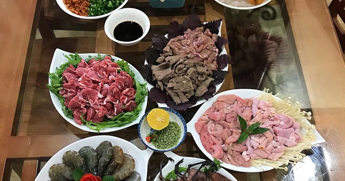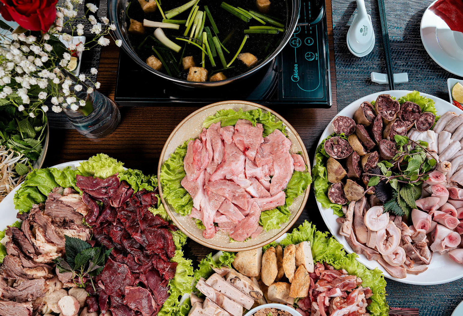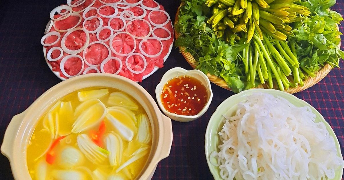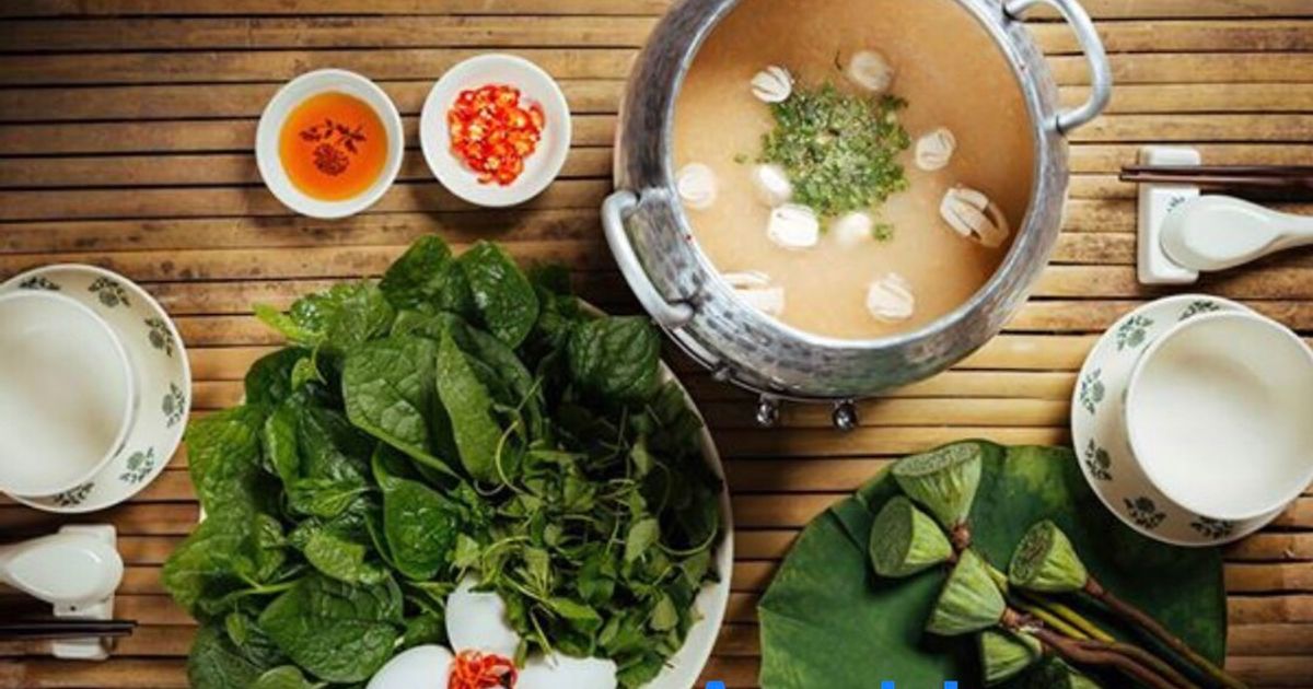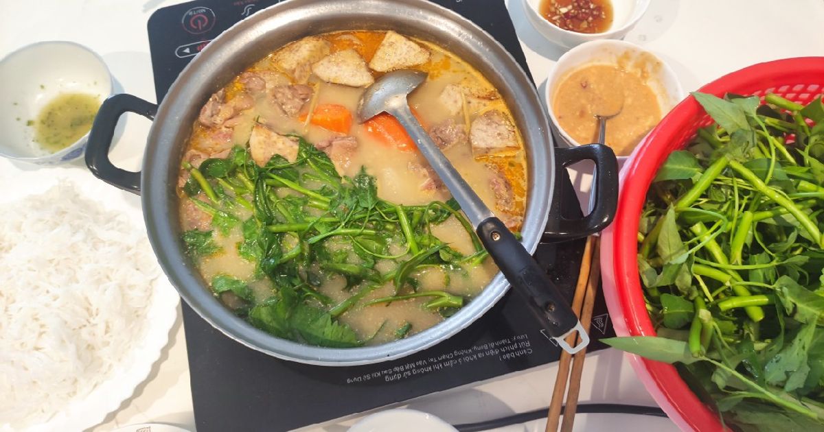 ✅Rau nhúng đa dạng: rau muống, cải thảo, bông bí, nấm kim châm, bông súng... giúp món ăn phong phú và cân bằng vị béo.