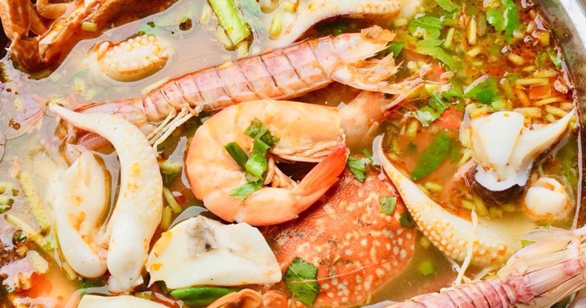 Lẩu Thái nổi bật với vị chua cay đặc trưng từ sả, ớt, lá chanh và nước cốt me, ăn kèm hải sản, tôm, mực hoặc thịt bò rất hợp vị.