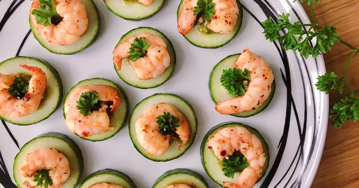 Dưa leo thái lát, đặt lên vài con tôm áp chảo thơm nức, rắc chút rau mùi và sốt nhẹ, vừa tươi mát vừa hấp dẫn.