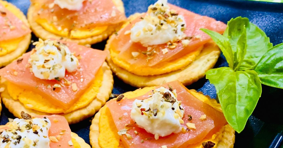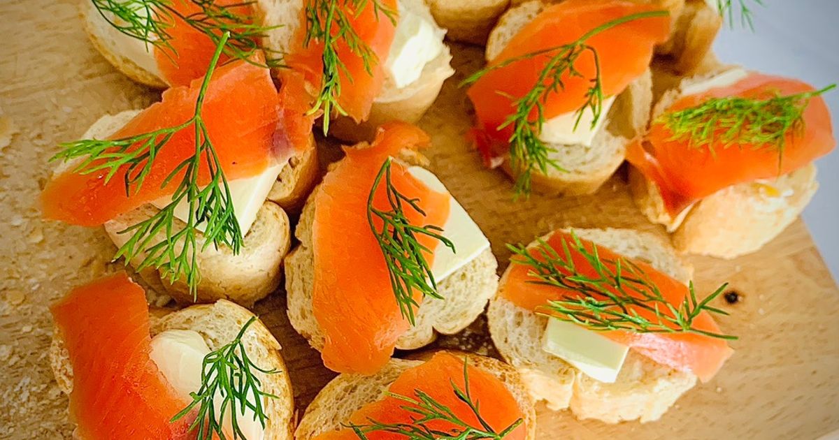 Món “nhỏ mà sang” đúng nghĩa. Phết kem phô mai lên lát cá hồi, cuộn lại, thêm thì là và chút tiêu. Vừa sang trọng, vừa phù hợp tiệc đứng.